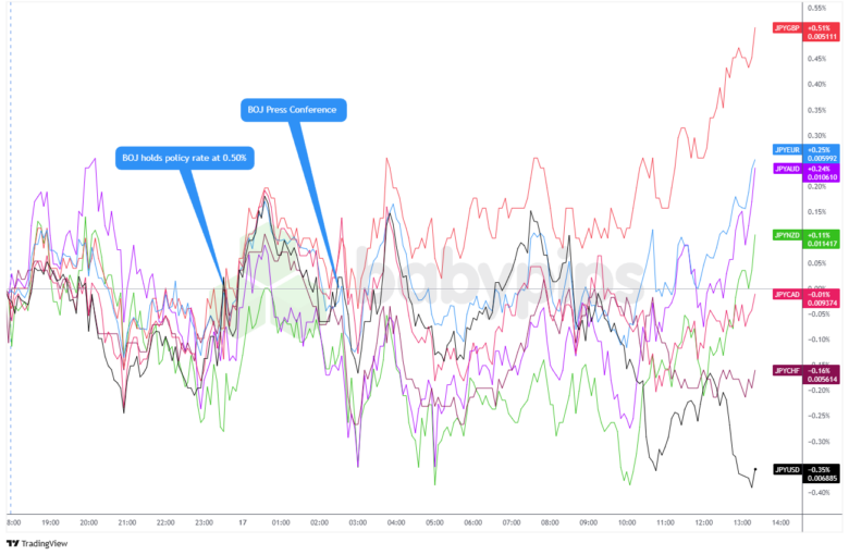 The yen’s initial reaction was uniformly net positive in the first couple of hours after the statement release, but the moves were capped as expected as traders likely awaited more details from the following press conference.