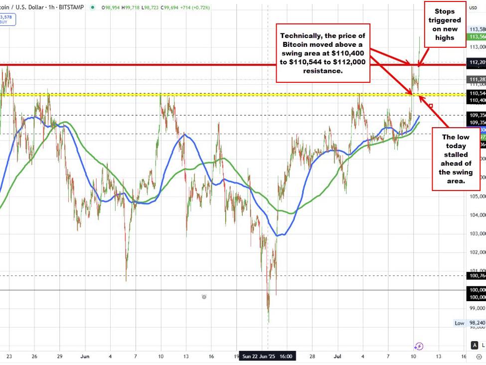 From a technical standpoint, Bitcoin’s breakout began yesterday after it cleared the key swing area between $110,400 and $110,544—a zone that had capped gains earlier. Price action then surged to $112,000, aligning with the high from May 22. After a modest pullback earlier today, dip buyers stepped in just ahead of the $110,544 area, confirming it as a key near-term support level.