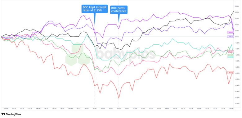 CAD briefly clawed back some losses but dipped again when Governor Macklem declined to offer a policy timeline and stressed the “unusual uncertainty” surrounding the outlook. His remarks about divided council views and readiness to adjust policy “if the outlook changes” likely kept the idea of future rate cuts on the table.