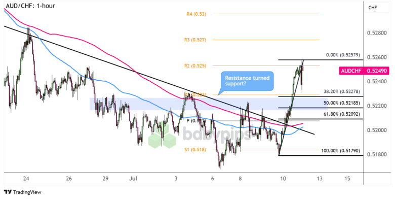 In case you missed our AUD/CHF bounce watchlist setup and the pair’s surge past the descending trend line resistance, there could still be an opportunity to catch the reversal if the pair pulls back to nearby Fibonacci retracement levels.