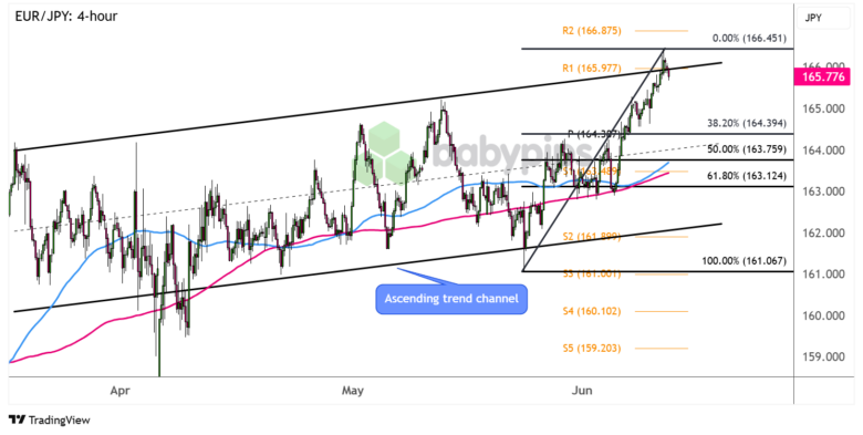 EUR/JPY has been cruising steadily higher inside an ascending channel on its 4-hour time frame, and it looks like a trend pullback could be due soon.