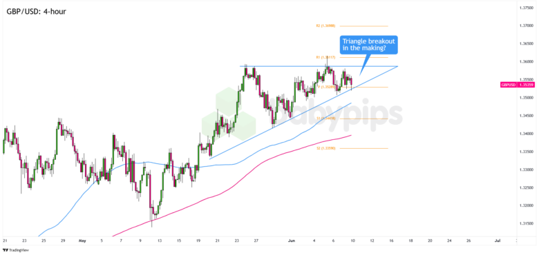 But if the pair drops below trend line support, GBP/USD may retreat toward the 100 SMA near 1.3500 or even the S1 support around 1.3342, a former area of interest.