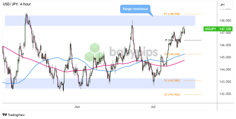 Should USD/JPY be able to form long green candlesticks closing above the range resistance, look out for a rally that could take it up to the next upside target at R2 (149.68) or even a climb that could last by the same height as the rectangle pattern.