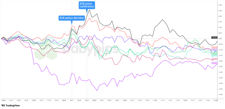 EUR caught another bid during Lagarde’s press conference, but the rally did not last. As traders digested the ECB’s balanced tone and shifted focus back to weak U.S. inflation data, the euro’s gains quickly faded.