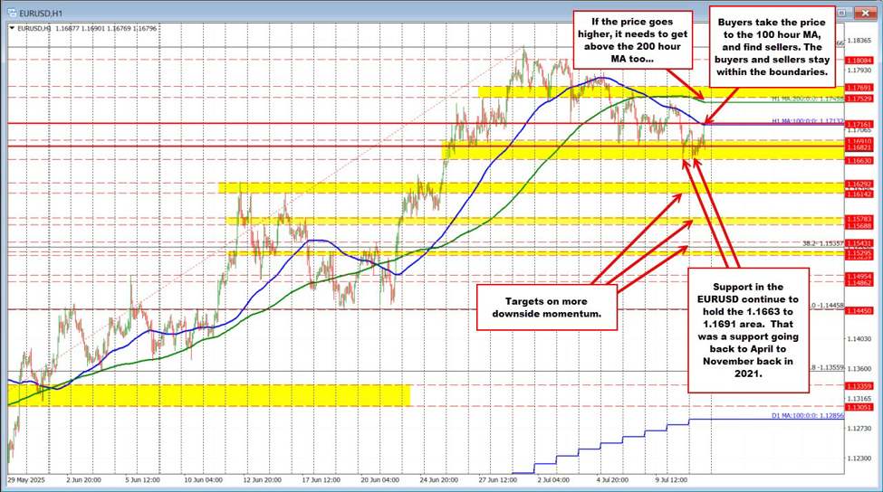 On the upside, the pair has pushed back toward the 100-hour moving average (blue line, currently near 1.1713), but sellers have leaned against that level, capping momentum and keeping the price confined. The 200-hour moving average, now near 1.1745, adds another layer of resistance. For now, price action remains trapped between well-defined boundaries—support below and key moving average resistance above.
