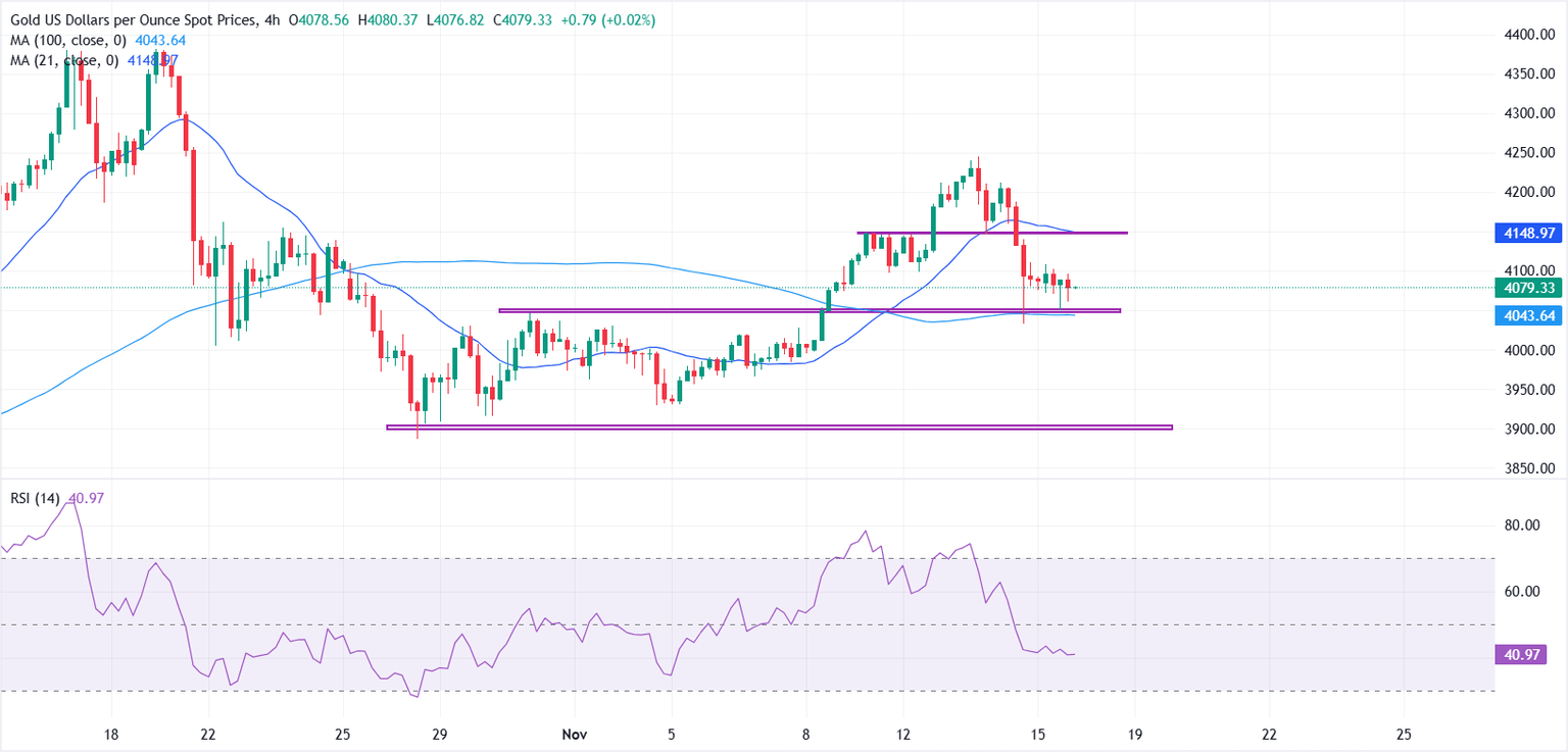 The near-term outlook for Gold appears range-bound, with the 4-hour chart showing repeated support emerging around the 100-period SMA near $4,043. This level also aligns closely with the upper boundary of the previous consolidation zone, reinforcing its importance as a strong support area.