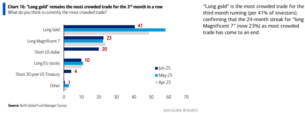 The BofA Global Fund Manager survey is always a nice snapshot of the current positioning and thinking in the markets. According to the latest survey, “long gold” remains the most crowded trade for the third month in a row. Gold had lots of tailwinds this year with stagflationary fears and geopolitical events. The next most crowded trades are “long Mag 7” and “short US dollar”.