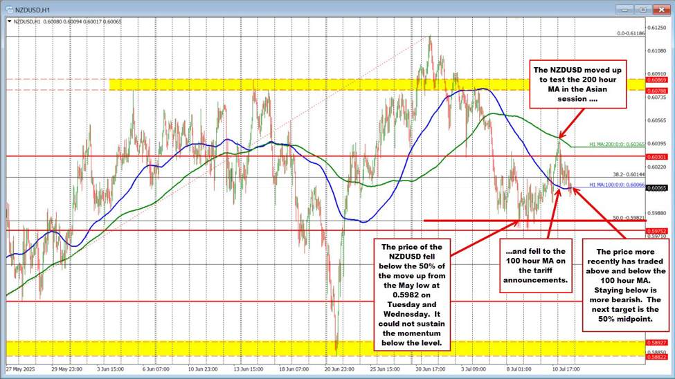 The NZDUSD started the week under pressure, with the move lower beginning near the 200-hour moving average, which sat at 0.6061 at the time. Monday’s high reached 0.6058, but sellers leaned against that level, triggering a move to the downside. The decline extended into Tuesday and Wednesday, with the pair breaking below the 50% retracement of the May low-to-June high rally, which comes in at 0.5982. While the pair traded below that key level on three separate occasions, including a Wednesday low of 0.5975, it failed to build sustained momentum below the midpoint.