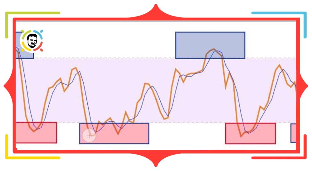When two lines are above the upper level of 80% (marked with blue zones at the top), the instrument is overbought. When they fall below the bottom horizontal line of 20% (red zones in the bottom), it’s oversold. This is how the user can easily spot the overbought and oversold levels of the market.