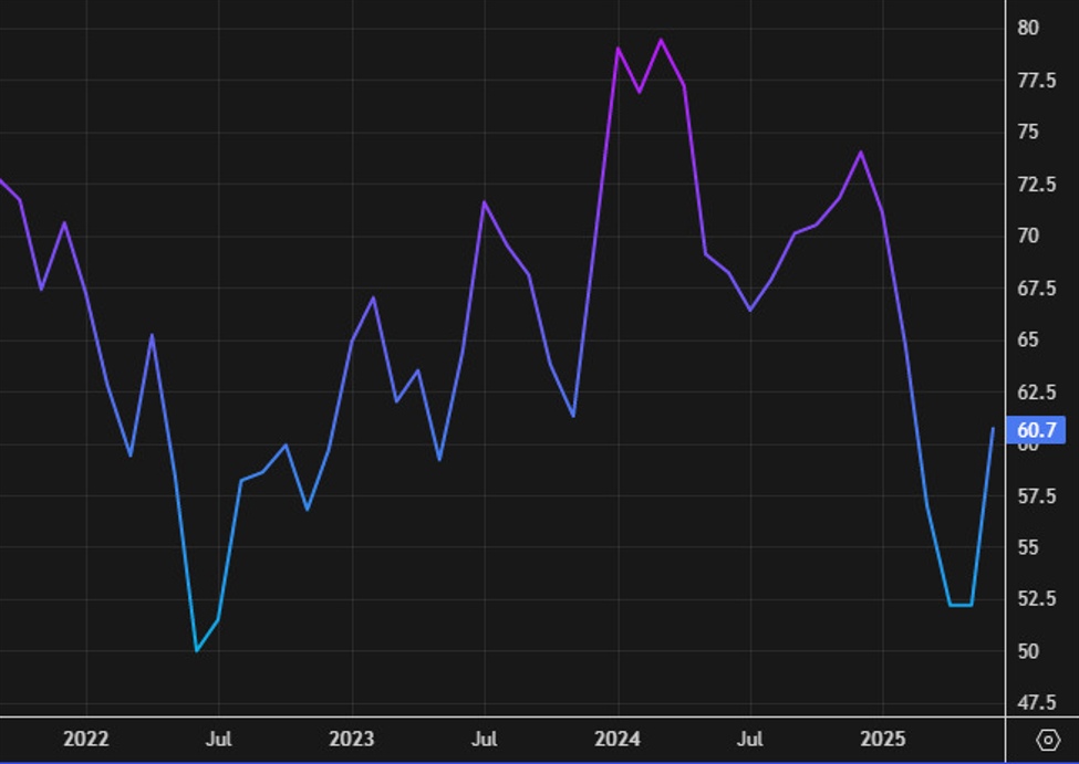 Sentiment has rebounded from the April-May lows but still remains far below the levels from late 2024. The market reaction to the report has been minimal.